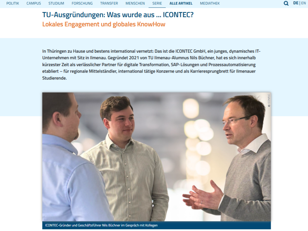 ICONTEC Geschäftsführer Nils Büchner war vor kurzem im Interview mit UNI ONLINE. Das Ergebnis ist ein Artikel, welcher insbesondere unsere enge und seit jeher gewachsene Verbindung zur Technischen Universität Ilmenau – und damit auch unsere Rolle als Sprungbrett für Studierende in die IT-Beratung – beleuchtet.
